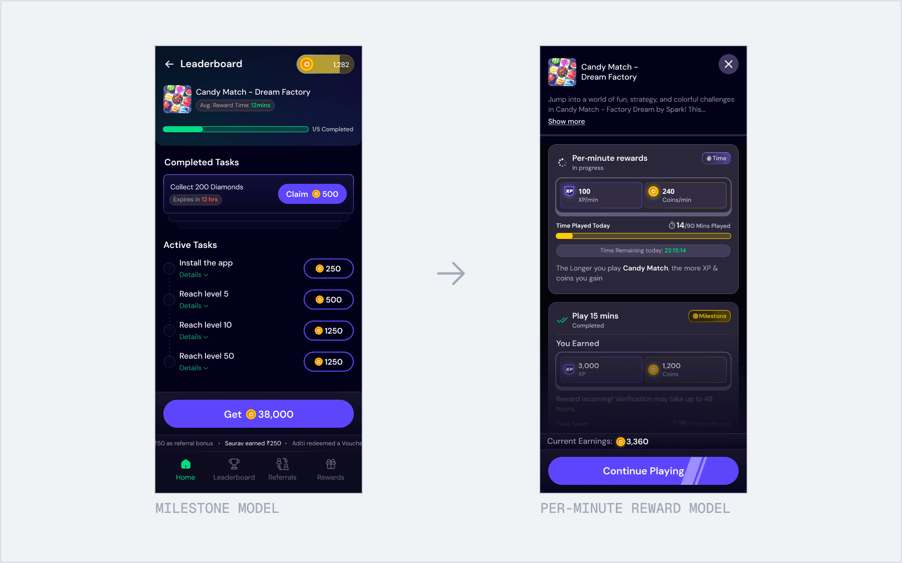 Instead of tying rewards to specific in-game levels, we introduced a per-minute earning system. Users now earned coins based on active playtime.