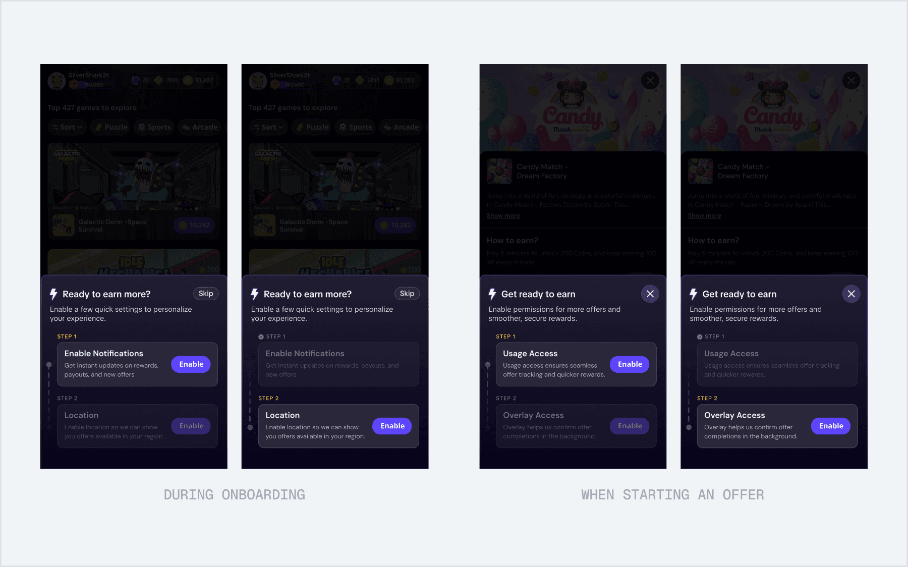Issues: Completion rate after onboarding permissions was around 63%. Over one-third of users dropped before starting an offer. The issue wasn’t the permissions themselves. It was the timing.