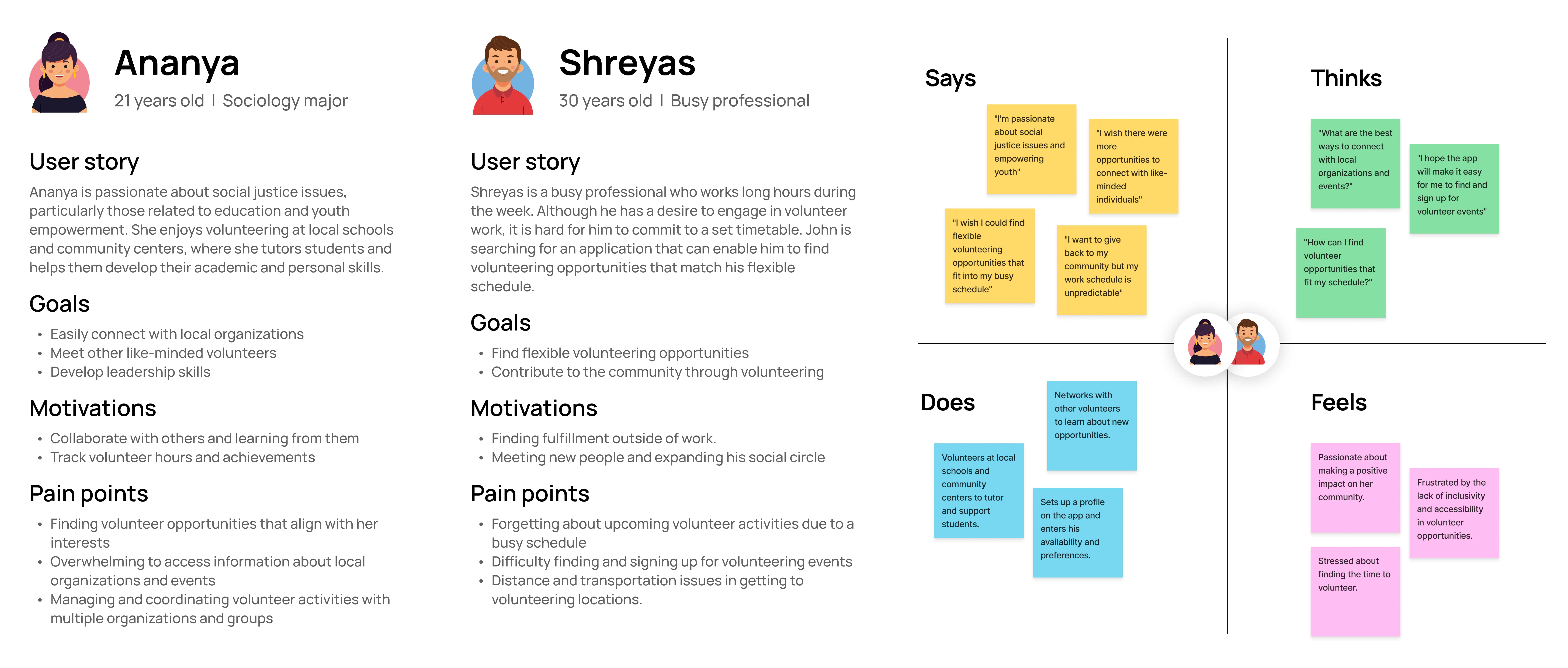 Based on the insights and observations from the research methods, I created two personas that captured the essence of the users and their characteristics. I also formed empathy maps to understand their needs and frustrations in more detail.