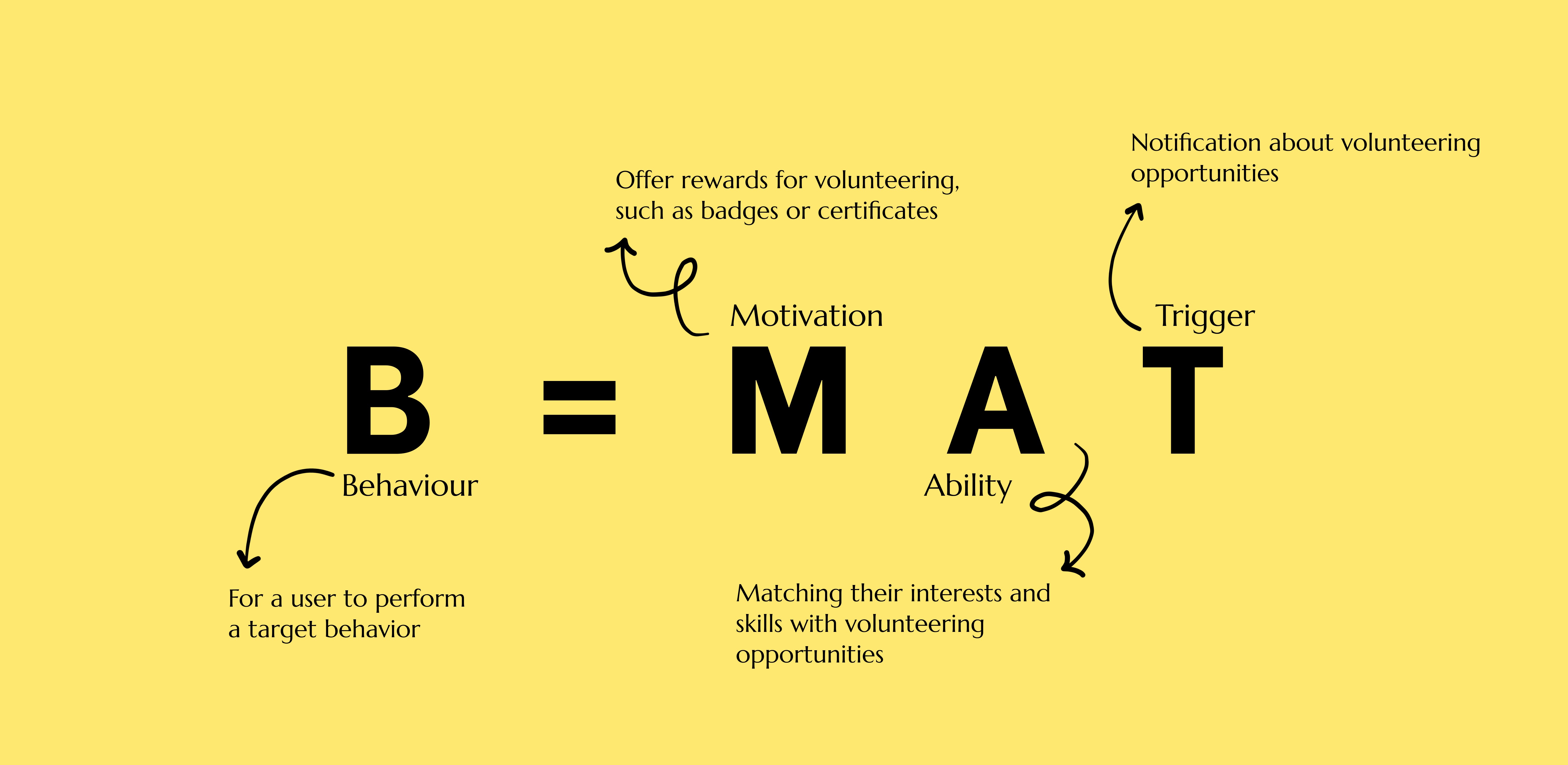 While researching habitual frameworks, I found the Fogg Behavior Model to be particularly relevant for the volunteering app. This model highlights the importance of motivation, ability, and trigger in encouraging a behavior.